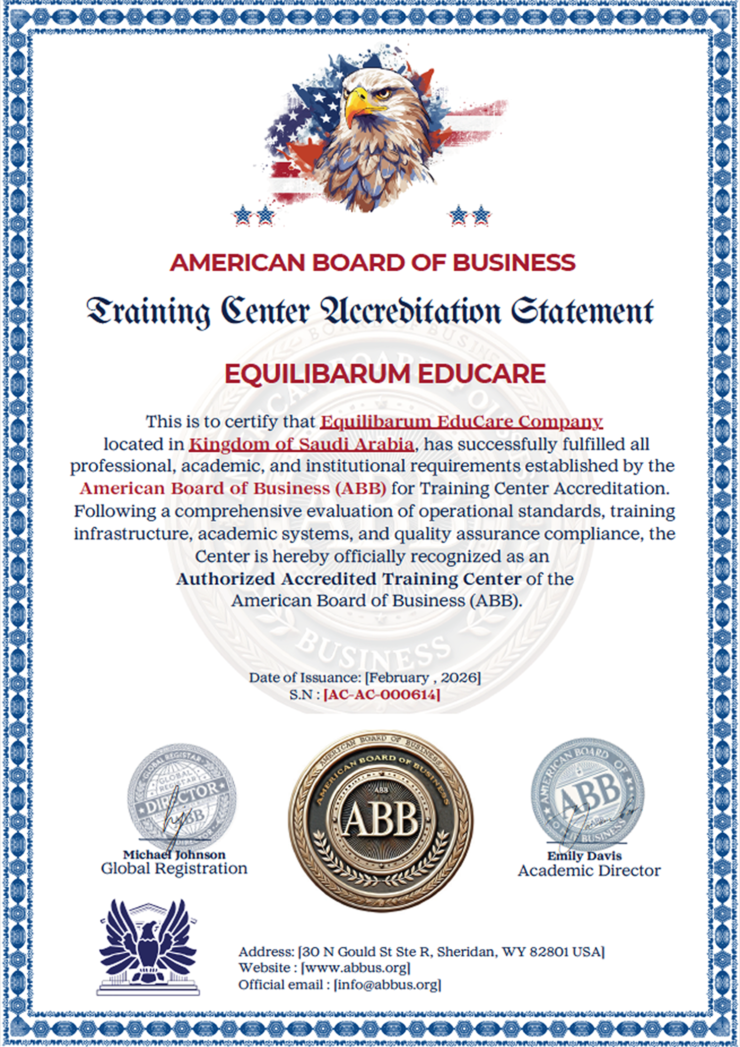 اعتماد رسمي لشركة Equilibarum EduCare كمركز تدريب معتمد من American Board of Business (ABB) بعد استيفاء معايير الجودة الأكاديمية والتشغيلية.