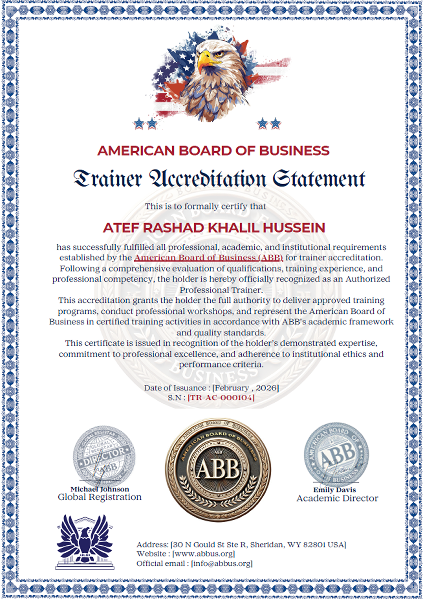 اعتماد رسمي من American Board of Business (ABB) يؤكد استيفاء المعايير المهنية والأكاديمية لتقديم البرامج التدريبية وقيادة ورش العمل وفق المعايير الدولية.