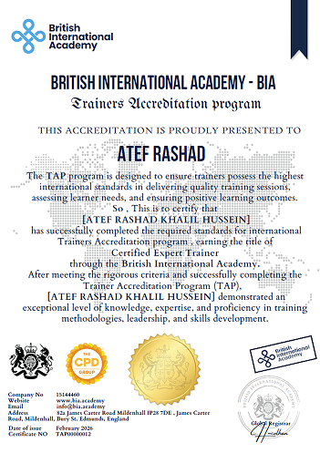 شهادة Certified Expert Trainer من British International Academy (BIA) ضمن برنامج اعتماد المدربين الدولي، وفق أعلى معايير جودة التدريب وتطوير المهارات القيادية.